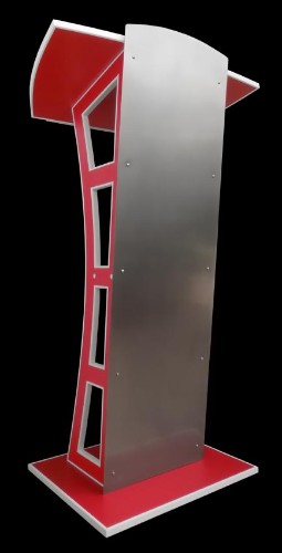 Material: Tablero melamínico de color a elegir y resistente canto rígido de PVC. Placa frontal de acero inoxidable. Bandeja interior de metacrilato transparente. Reposalibros de aluminio anodizado. Diseño: Formas rectas y caladas. Amplia bandeja superior de documentos. Medidas: 75*42 cm Medidas: Altura media total de 120 cm. Bandeja: INCLUÍDA. Metacrilato transparente. Complementos opcionales: Micrófono, Iluminación, Preinstalación de Sonido, Vinilo, Anillas ...  Color: Amplia carta de colores de melamina a elegir:  Formulario de contacto: